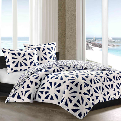 A duvet set with a bold bright pattern of starbursts in navy and white brings fresh excitement to your room. Choose your favorite accent colors to complement either a modern or traditional design that just needs some updating. The 100% cotton sateen fabric is both soft and airy. Time to dream. AllModern.com.