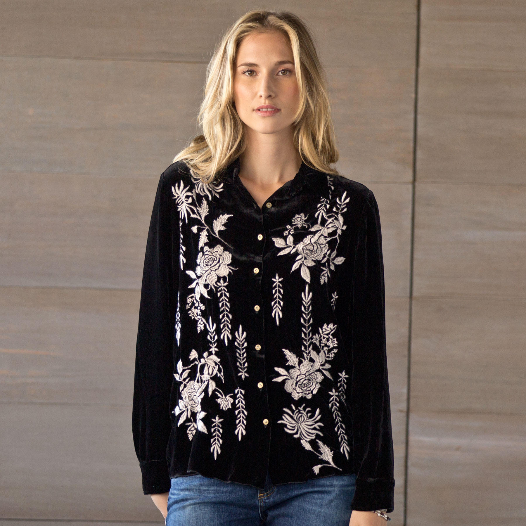Love a soft, elegant look that just flows with jeans alone, or pair with a long, cream ruffle skirt for a night out. Always elegant velvet gets the royal treatment with contrasting, floral embroidery. Fairytale flowers in delicate stitches elevate this collared, button-up top to a true work of art. Rayon/silk. (Sundance Living)