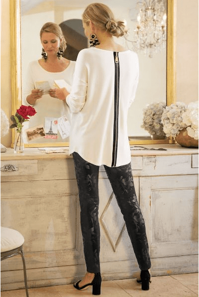 When a graphic cream sweater with a long back zip meets slim midnight floral pants, the best of both worlds is achieved. Wear to the art studio, and to an evening out. Minimalist sandals complete an entire chic and nonchalant look. Softsurroundings.com