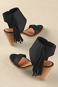 Autumn requires a certain sense of knowing what to wear on those transitional days, when it may be both warm and cool. Enter the Tia sandal. A wide ankle wrap, stacked heel and flirty suede fringe add a fun edge to skirts and dresses. Black or tan.