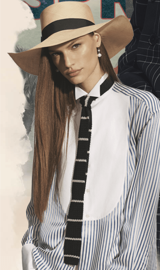 Combining the unexpected can have an appealing affect. A striped tuxedo blouse with a classic white bib are pulled together with a slim, widely spaced striped knit necktie. A floppy straw Fedora and drop pearl earrings top off the look, creating a smart feminine statement. RalphLauren.com