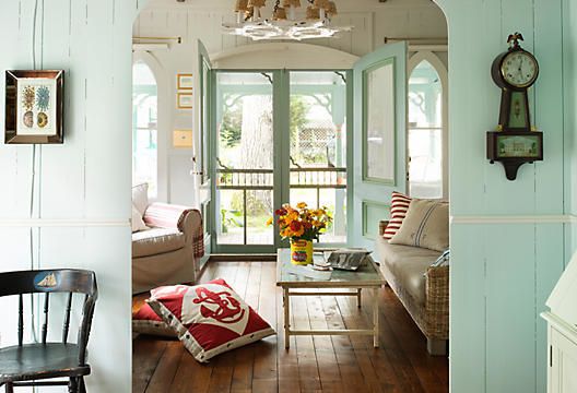 Summers in New England bring to mind visions of Cape Cod. Cottage style materials and colors may be applied when desiring a casual, chic, “by the sea” feeling. Batten and board siding is not just for exteriors. This can be utilized on an interior wall as a feature, or the roofline of a screened patio, or sunroom. Color washes of whitened sage, sand, fresh sky blue, sunlight yellow, and cloudy grey, are all part of the soft sea palette. Infuse your favorite vintage antiques, nautical motifs, white canvas furniture, colorful pillows, and cozy quilts.