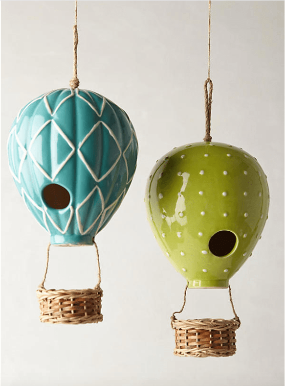 For the garden, deck or patio, ceramic hot air balloons in fun colors and patterns serve as whimsical birdhouses. A wooden perch leads to the inside of the house, and an attached rope allows for hanging in the ideal spot for viewing. Anthropologie.com