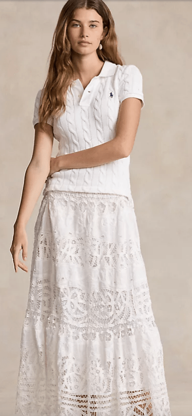 Tennis whites are elevated to new heights by combining a sporty cable knit top with a long skirt. Try a white cable knit sweater tee with a long white Battenberg lace skirt for a feminine look that can be worn throughout the day and into the evening. Another option is the cable knit, sleeveless V–neck with bold stripes at the neckline and waist, worn with a flowing long white skirt. Pull the look together with ballet flats, tennis shoes, or sandals. RalphLauren.com