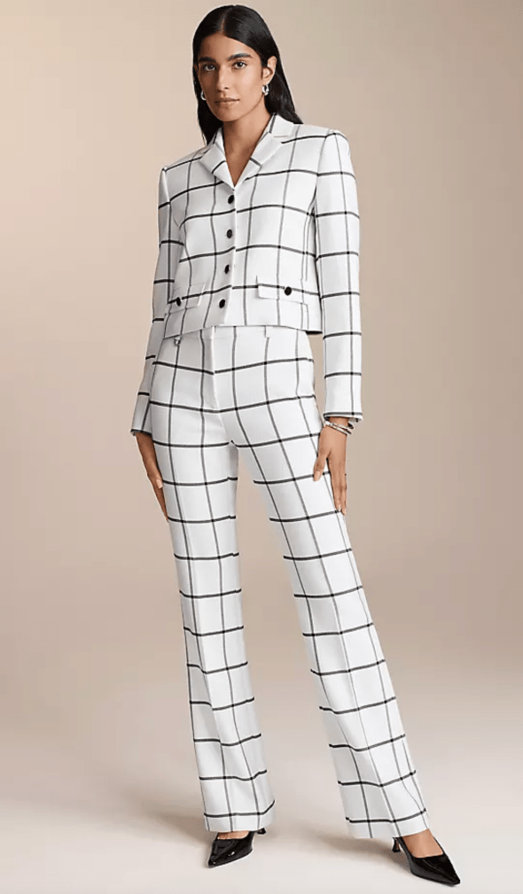 A winter wonder! Lighten up in winter and enjoy during all seasons in this fresh, windowpane patterned suit. A sleeveless shell is layered with a cropped blazer with military flap pockets and buttons. Beautifully silhouetted pants have slightly flared bottom, belt loops, side front pockets, and back flap pockets. For a bright holiday accent, add a red silk scarf at the neckline or your favorite holiday pin. Machine washable. anntaylor.com