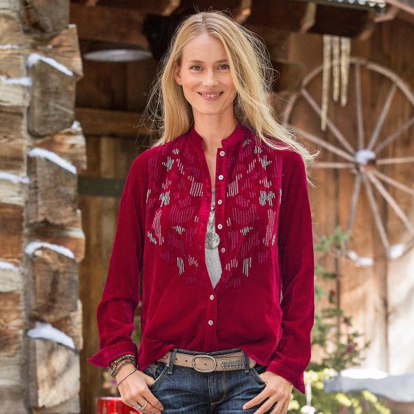 Lovely and luxurious deep red velvet blouse has modern, graphic embroidery patterns with a newly invented look and feel. Embroidered button-front velvet, double button cuffs and back pleat. Casual, rich…