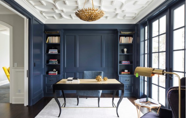 A study in deep blue. Easing into a modern update, the tendency toward warmth comes alive in an open office, enhanced by a deep, ink blue paint, complementary deep blue…