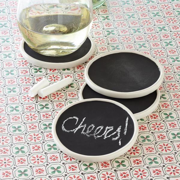 Add your own touch to a get together or holiday party! Have fun with creative and practical black stoneware, chalkboard coasters with white trim. Guests may write their name to…