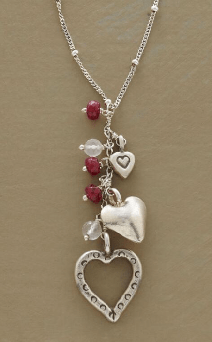 For Valentine’s Day, roses are sweet and calming in any form. A necklace with floating hearts cascades among garnet and rose quartz stones. Handcrafted, sterling silver.