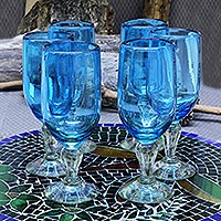During the hot days of summer, a refreshing chilled glass of water or your favorite beverage is enhanced in sturdy, elegant aqua colored glasses. Set of six blown glass goblets…