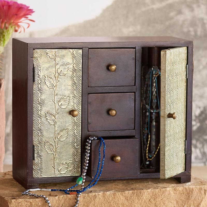 Open the stamped metal doors to reveal rotating dowels with hooks for necklaces and bracelets. three drawers stow rings and earrings. A Sundance exclusive. 13″W x 5″D x 11″H. (Sundance…